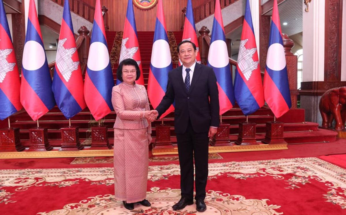 ການນຳຂັ້ນສູງ ຕ້ອນຮັບປະທານສະພາແຫ່ງຊາດກຳປູເຈຍເຂົ້າຢ້ຽມຂໍ່ານັບ