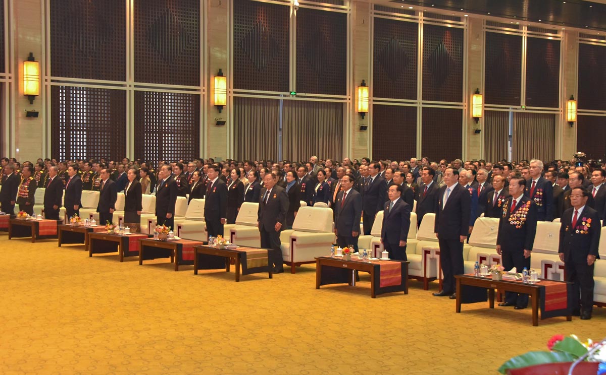 ໃນພິທີອັນສຳຄັນຍິ່ງນີ້, ພວກເຮົາສຸດທີ່ອາໄລອາວອນແລະຈົດຈໍາລໍ້າລຶກບຸນຄຸນອັນປະເສີດຂອງປະທານໄກສອນພົມວິຫານຜູ້ນໍາທີ່ເຄົາລົບຮັກ, ຜູ້ນໍາພາກໍ່ຕັ້ງຝຶກຝົນຫຼໍ່ຫຼອມ, ຖະນຸບໍາລຸງສ້າງພັກເຮົາໃຫ້ເຕີບໃຫຍ່ເຂັ້ມແຂງ, ຜູ້ນໍາພາພາລະກິດປະຕິວັດແລະນຳພາສ້າງຕັ້ງລະບອບປະຊາທິປະໄຕປະຊາຊົນ, ຜູ້ອອກແບບ, ບຸກເບີກແລະນໍາພາພາລະກິດປ່ຽນແປງໃໝ່ຢູ່ປະເທດເຮົາ. ພ້ອມກັນນີ້,ພວກເຮົາກໍມີຄວາມຄິດຄະນຶງຫາແລະຈົດຈໍາລໍ້າລຶກເຖິງວິລະກໍາອັນລໍ້າເລີດ, ການເສຍສະຫຼະອັນໃຫຍ່ຫຼວງຂອງບັນດາຜູ້ນໍາຮຸ່ນກໍ່ຕັ້ງແລະຮຸ່ນສືບທອດຂອງພັກ, ພະນັກງານ-ສະມາຊິກພັກ, ນັກຮົບປະຕິວັດແລະປະຊາຊົນລາວຜູ້ຮັກຊາດທີ່ໄດ້ອຸທິດເລືອດເນື້ອ, ເຫື່ອແຮງເຂົ້າໃນພາລະກິດປະຕິວັດ, ເພື່ອຄວາມເປັນເອກະລາດແຫ່ງຊາດ, ອິດສະຫຼະພາບແລະຄວາມສົມບູນພູນສຸກຂອງປະເທດແລະປະຊາຊົນລາວໃນໄລຍະທີ່ຜ່ານມາ.