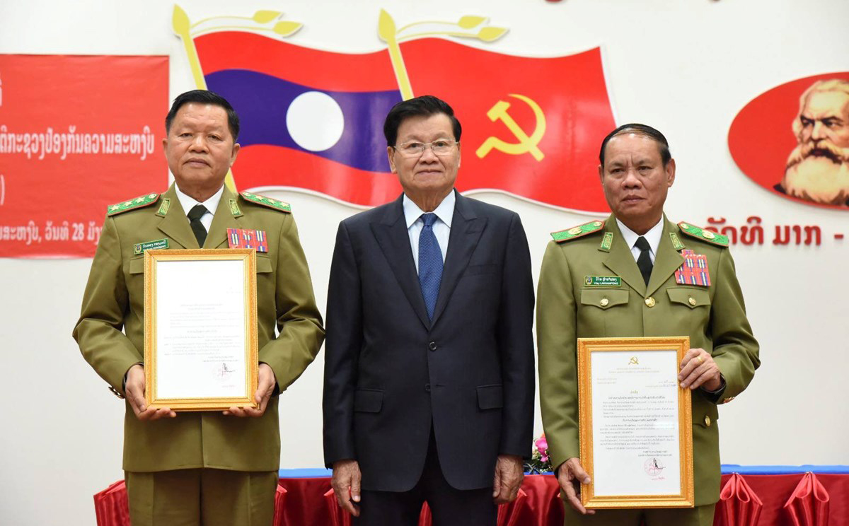 ພິທີມອບ-ຮັບໜ້າທີ່ເລຂາຄະນະບໍລິຫານງານພັກ ລັດຖະມົນຕີກະຊວງປ້ອງກັນຄວາມສະຫງົບ ລະຫວ່າງ ຜູ້ເກົ່າ ແລະ ຜູ້ໃໝ່ ຂຶ້ນໃນວັນທີ 28 ມັງກອນ ນີ້, ໂດຍການເຂົ້າຮ່ວມຂອງ ສະຫາຍ ທອງລຸນ ສີສຸລິດ ເລຂາທິການໃຫຍ່ ປະທານປະເທດ, ມີຮອງລັດຖະມົນຕີ, ຄະນະພັກ-ຄະນະກົມໃຫຍ່, ຫ້ອງວ່າການ, ວິທະຍາຄານ, ກອງບັນຊາການ, ພ້ອມດ້ວຍກົມ-ກອງອ້ອມຂ້າງກະຊວງປ້ອງກັນຄວາມສະຫງົບ, ແຂກຮັບເຊີນ ແລະ ນາຍຕໍາຫຼວດຂັ້ນນໍາພາ-ບັນຊາ ເຂົ້າຮ່ວມ.