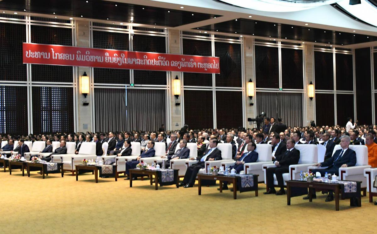 ປະທານ ໄກສອນ ພົມວິຫານ ໄດ້ສ້າງຄຸນງາມຄວາມດີອັນໃຫຍ່ຫຼວງທີ່ສຸດ, ອຸດົມການ ແລະ ການອຸ ທິດຂອງເພິ່ນແມ່ນຕິດແໜ້ນກັບພາລະກິດປະຕິວັດ ຂອງພັກເຮົາ. ຂ້າພະເຈົ້າ ຮຽກຮ້ອງມາຍັງທົ່ວພັກ, ທົ່ວລັດ, ທົ່ວກຳລັງປະກອບອາວຸດ ແລະ ທົ່ວປວງຊົນລາວທັງຊາດ ຈົງສາມັກຄີກັນເປັນປຶກແຜ່ນ, ພ້ອມກັນສືບທອດ ແລະ ເສີມຂະຫຍາຍພາລະກິດປະຕິວັດ ຂອງປະທານ ໄກສອນ ພົມວິຫານ ຜູ້ນຳທີ່ແສນເຄົາລົບຮັກ ຂອງພວກເຮົາໃຫ້ເຂົ້າສູ່ຊີວິດຕົວຈິງ, ປະທານ ໄກສອນ ພົມວິຫານ ສົມແລ້ວ ທີ່ເປັນວິລະບູລຸດ ທີ່ຍິ່ງໃຫຍ່ ຂອງຊາດລາວ, ເປັນນັກປະຕິວັດອົງອາດກ້າແກ່ນ, ນັກຮັກຊາດຜູ້ຍິ່ງໃຫຍ່, ລູກຜູ້ປະເສີດ ຂອງປະຊາຊົນລາວບັນດາເຜົ່າ, ປະທານໄກສອນ ພົມວິຫານ ຍືນຍົງໃນພາລະກິດ ຂອງພັກເຮົາ ແລະ ຢູ່ໃນດວງໃຈຂອງປະຊາ ຊົນລາວ ຕະຫຼອດໄປ.