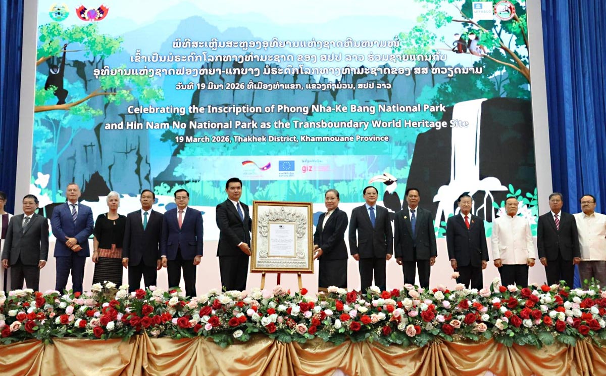 ວັນທີ 19 ມີນາ 2026, ທີ່ເມືອງທ່າແຂກ ແຂວງຄໍາມ່ວນ ໄດ້ສະເຫຼີມສະຫຼອງຢ່າງຍິ່ງໃຫຍ່ ເນື່ອງໃນໂອກາດທີ່ “ອຸທິຍານແຫ່ງຊາດ ຫີນໜາມໜໍ່” ໄດ້ຮັບຂຶ້ນທະບຽນເປັນມໍຣະດົກໂລກທາງທຳມະຊາດ ຮ່ວມຊາຍແດນກັບ ອຸທິຍານແຫ່ງຊາດ ຟອງຫຍາ-ແກບາງ ຂອງ ສສ ຫວຽດນາມ, ໂດຍເປັນກຽດເຂົ້າຮ່ວມ ຂອງ ທ່ານ ສອນໄຊ ສີພັນດອນ ນາຍົກລັດຖະມົນຕີ, ທ່ານ ໄຊຊະນະ ໂຄດພູທອນ ເລຂາພັກແຂວງ, ມີບັນດາການນໍາສູນກາງ, ແຂວງ, ອະດີດການນໍາ, ບັນດາອົງການສາກົນ ແລະ ແຂກຖືກເຊີນທັງພາຍໃນ ແລະ ສາກົນເຂົ້າຮ່ວມ.